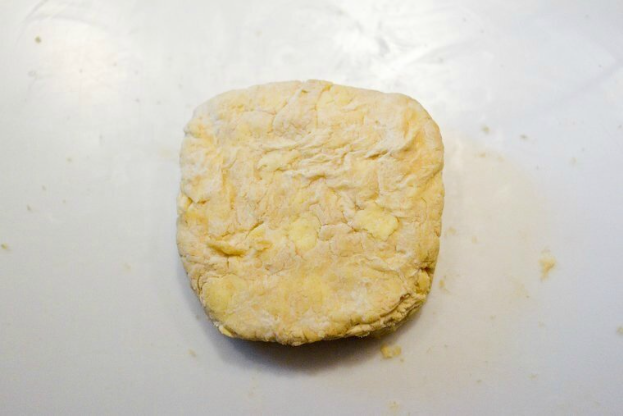 - Ajouter l’eau au mélange beurre/farine petit à petit tout en malaxant. Mais surtout très important, il doit rester des morceaux de beurre visible. Donner une forme carrée à la pâte.