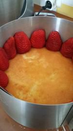 - Intercalez les fraises entre le cercle et le biscuit, faces coupées contre le cercle.