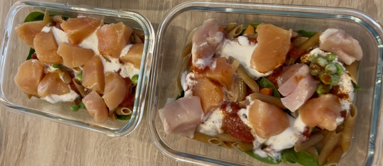 - Répartir dans la lunch box les pâtes précuites, une belle poignée d’épinards, les morceaux de carottes.