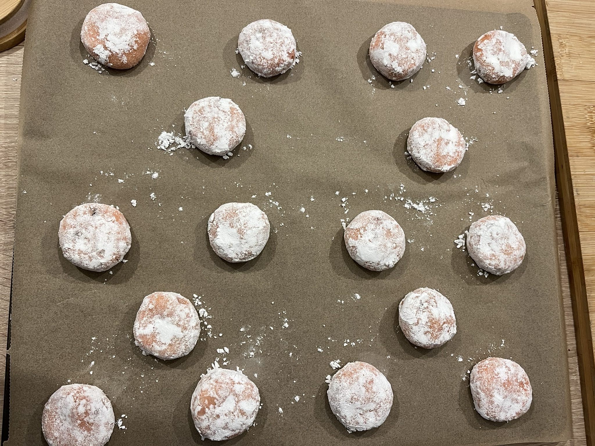 - Rouler généreusement votre boule en premier dans le sucre en poudre puis dans le sucre glace et disposer sur la plaque de cuisson en les espaçant.