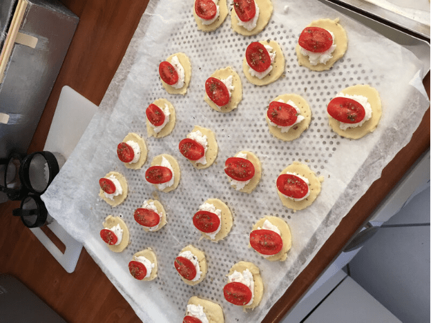 - Etaler sur chaque cercle un peu de pesto.