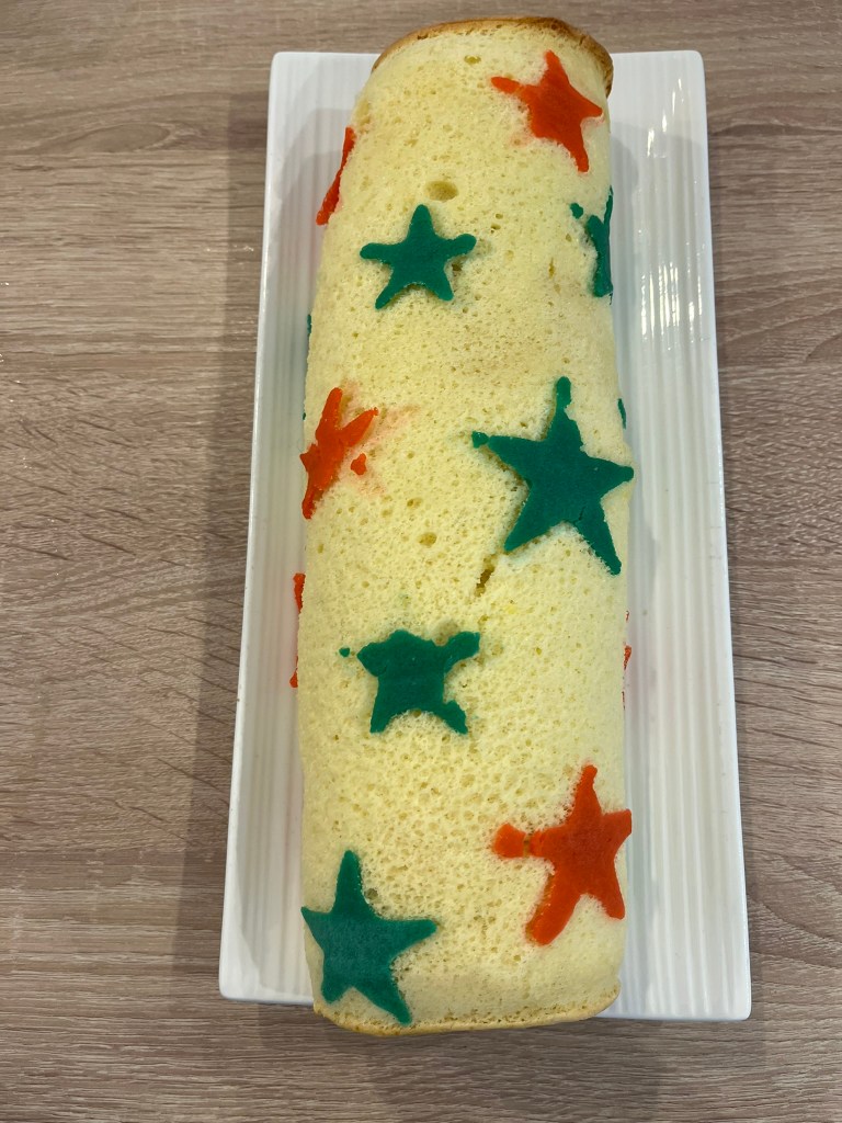 - A la sortie du four, rouler ton biscuit en laissant le papier cuisson et le laisser refroidir complètement enroulé pour qu’il puisse bien prendre sa forme.